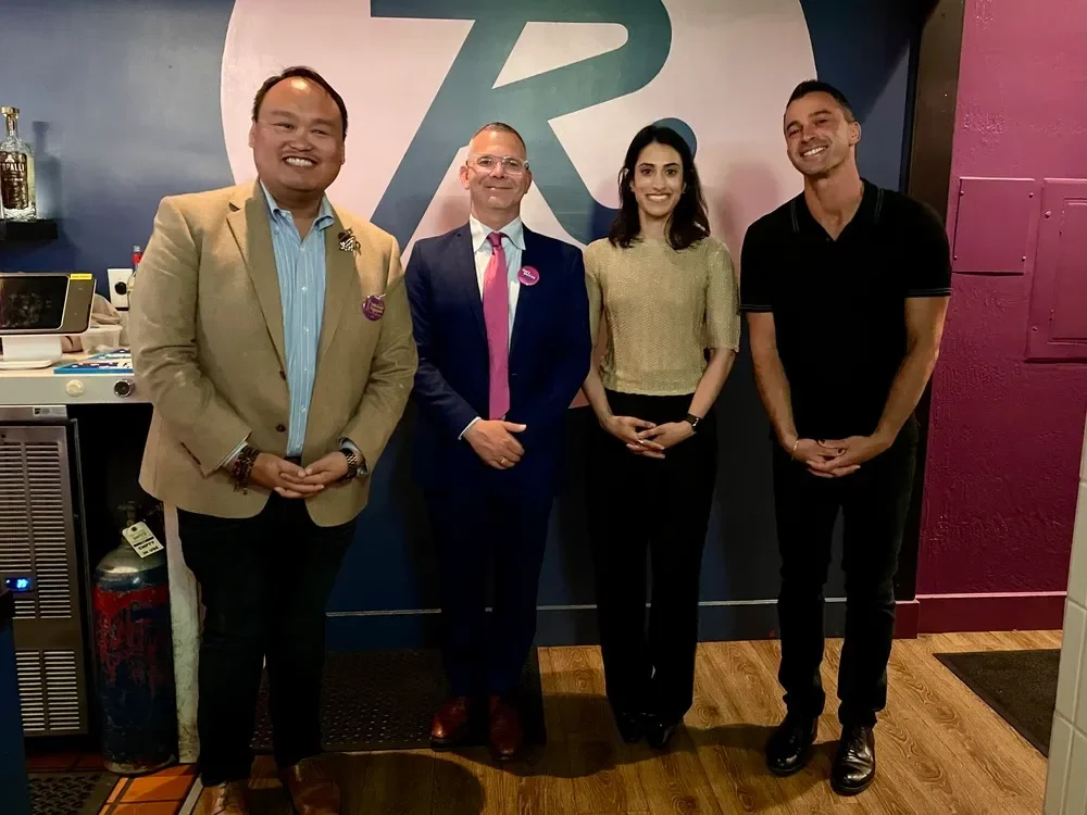 San Francisco District 8 supervisor candidates Michael Trung Nguyen, left, Gary McCoy, Darshini Patel, and Emanuel “Manny” Yekutiel attended an April 16 forum at Rikki’s, the women’s sports bar in the Castro.