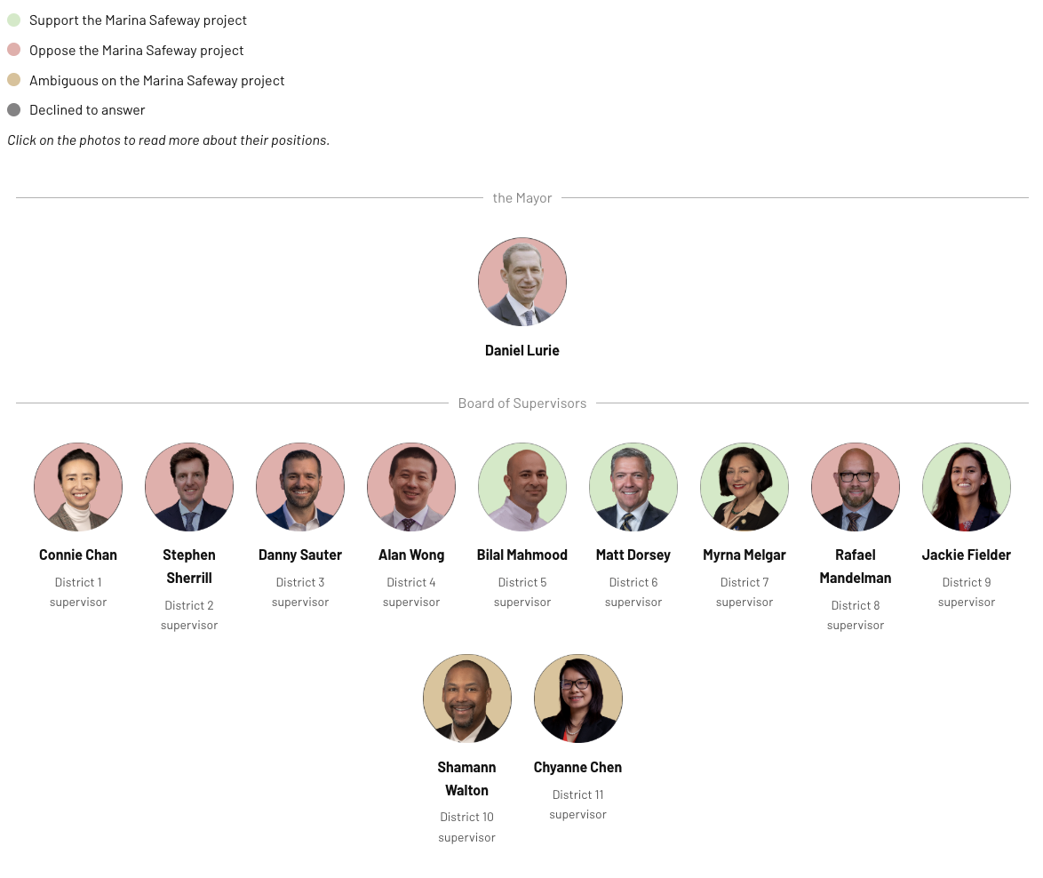 We need more housing in every neighborhood, especially the Marina. I appreciate that most of the recent Safeway proposals across the city are similar to the standards we had in mind when crafting the Family Zoning Plan: Reasonable additional height in commercial corridors. I think most people would agree with me that the Marina Safeway proposal doesn’t fit that, and I think we can do better.